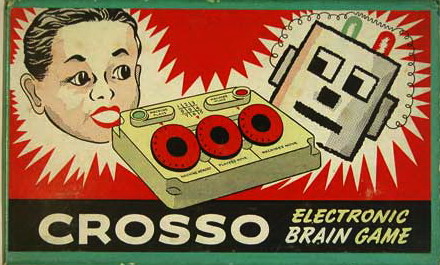 The CROSSO Electronic Brain Game is a very early electric noughts and crosses opponent sold by Nombrex Limited from Somerset, England. The computer opponent was made entirely of switches and lamps and was powered by a single 3V dry battery cell. Very little information is available on the machine and they seem to be pretty rare, but it is believed to have been produced in the late 1940s or early 1950s (the aesthetic looks to be more 1950s than 40s to me).